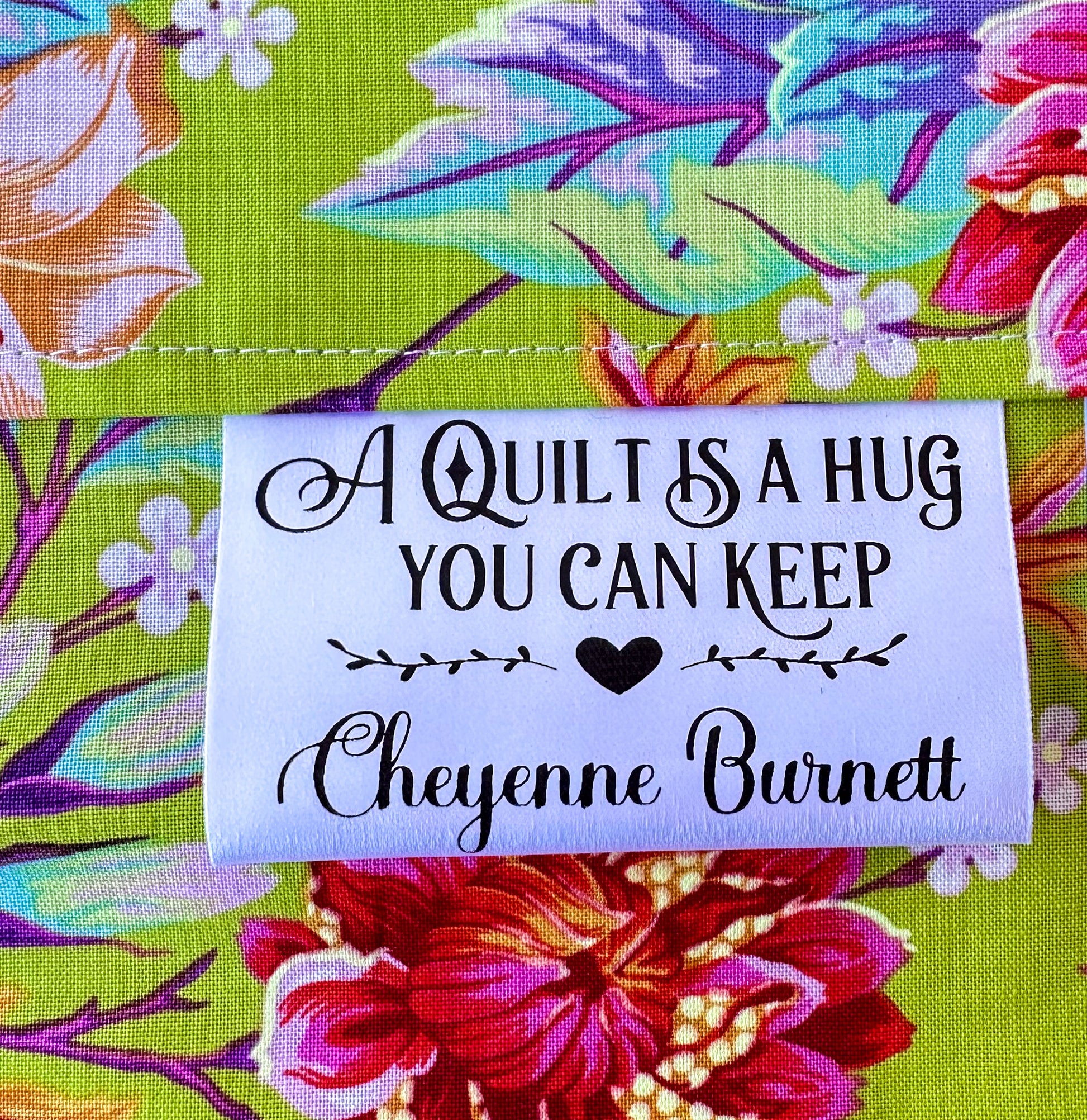 - Personalized satin quilt tag with the maker’s name included
